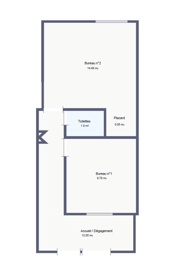 Il se compose : d’un accueil, d’un couloir desservant deux bureaux et un coin d’eau avec sanitaire.